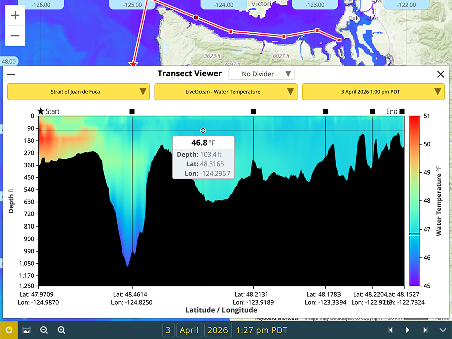NANOOS is excited to provide a new tool on NVS that visualizes model output conditions throughout the water column along a path. Choose a model (LiveOcean or OSU ROMS), then users can select an existing Transect or create their own by clicking the "New Transect" button at the top of the "Transects" panel then clicking on the map to add points. Double-click to add the last point. Then select the variable and day/time of interest. Log in to save the Transect, which can be edited (change locations, name, color). Use the "Divider" function to expand the surface layer resolution. As always, let us know your thoughts in the Comments.