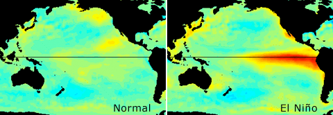 Climate variation is when climate patterns are disrupted by phenomenon like the El Nino-Southern Oscillation (ENSO) or Pacific Decadal Oscillation (PDO). In both cases these phenomenon are not directional, but rather vary between positive and negative phases of state. With El Nino, the positive state of ENSO, the PNW winters are often warmer, coastal upwelling can be reduced, and coastal waters are often measurably warmer. With La Nina, the negative phase of ENSO, PNW temperatures are usually colder, both in the air and the ocean. The typical duration of either phase of ENSO is about a year or less. The PDO is similar, but operates on a longer timescale, usually about 20 years between the cold, wet versus the warm, dry phases.