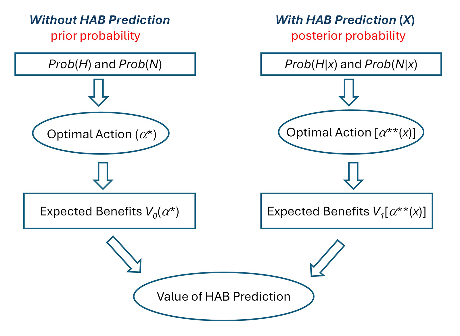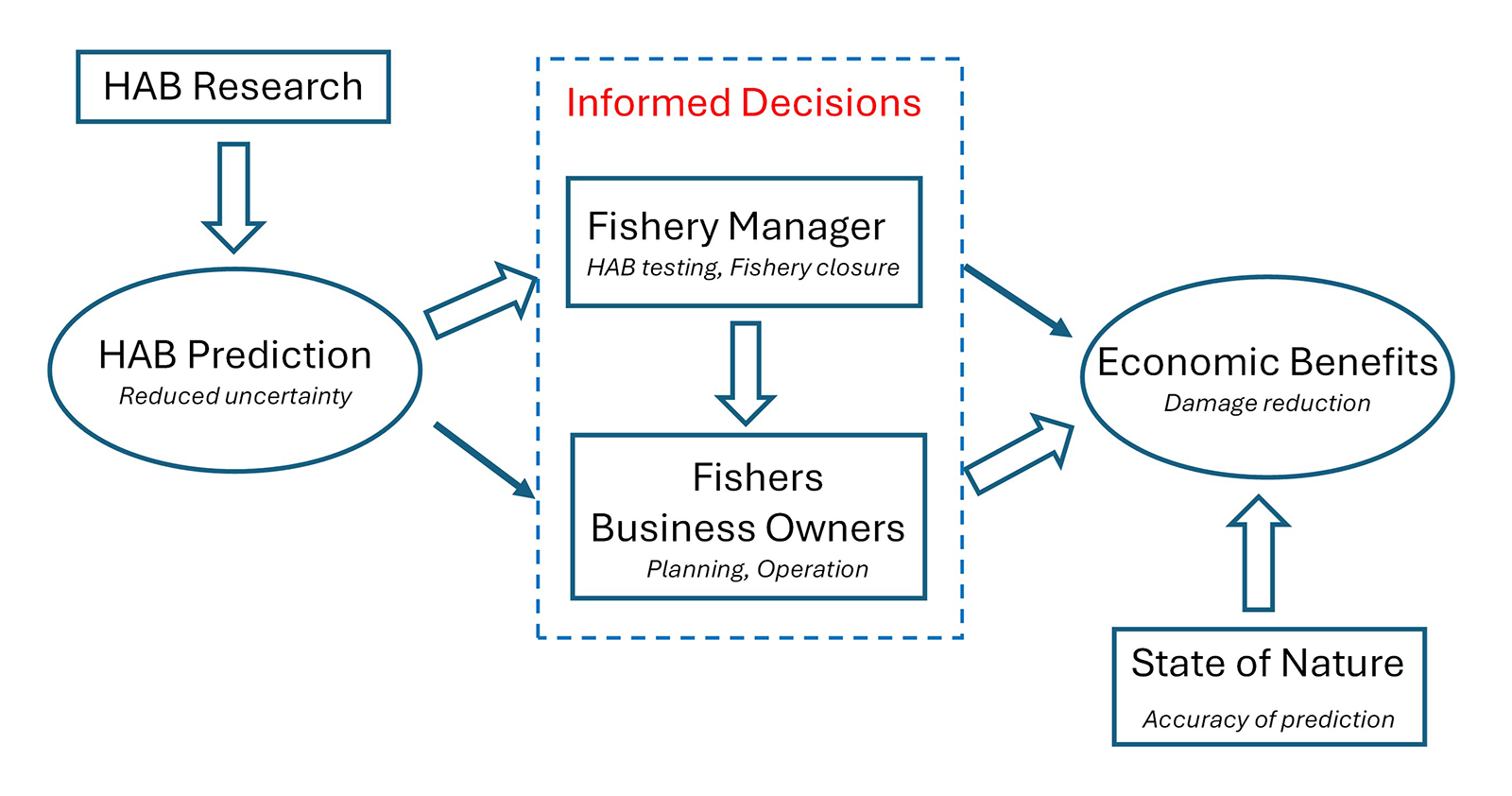 Researchers at the Marine Policy Center at Woods Hole Oceanographic Institution estimated the economic benefits of the PNW HAB Bulletin. They found the publication of the Bulletin has led to better-informed decision-making and choices of management actions, which in turn have advanced public health goals and have improved economic conditions in coastal communities. The value of HAB predictions is realized through behavioral changes resulting from alternative decisions in response to a forecast of sufficient accuracy.