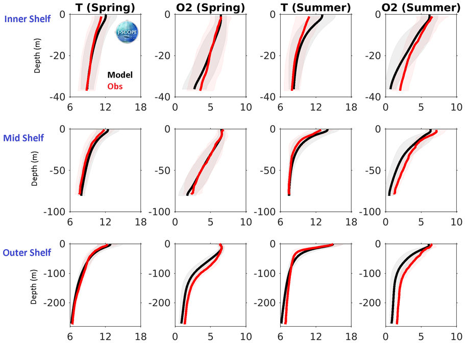 A comparison of model and observational climatologies from three locations (inner, mid, and outer shelf) along the Newport Line on the Oregon shelf. The model climatology (black) is the average of the 2009 - 2014 hindcasts, at each location and depth. The observational climatology (red) is based on twice-monthly samples. The standard deviation around each climatology is shaded in the background. Temperature and oxygen profiles are shown from Spring (April - June) and Summer (July - September).