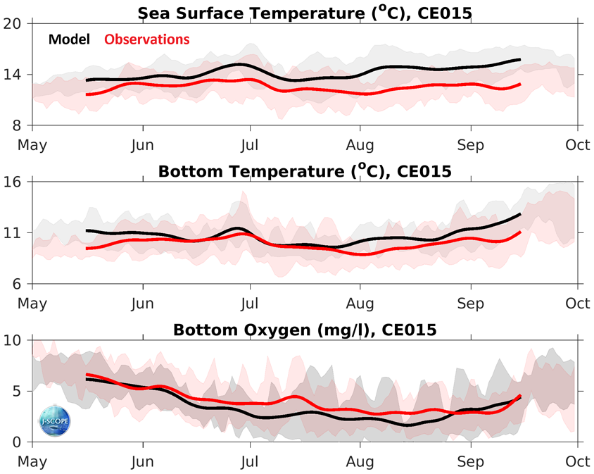 Time series of the observational climatology (red) from the OCNMS mooring location, CE042, off the Washington shelf in 42 m of water. The model climatology (black) is the average of the 2009 - 2014 hindcasts. The time series have been smoothed with a 30-day filter. The standard deviation around each climatology is shaded in the background. Observations are in red and the model is in black. (top) SST, (middle) bottom temperature, and (bottom) bottom oxygen (mg/l).