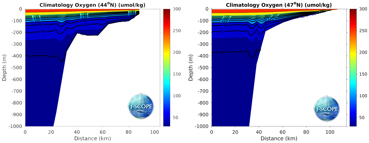 The model climatology spanning 2009 - 2014 for oxygen (umol/kg) from two cross sections (distance offshore vs depth) from the Washington shelf (Cape Elizabeth ~47 N) (right) and Oregon shelf (Heceta Bank ~44N) (left). The cross sections are averaged over the upwelling season (April - September).