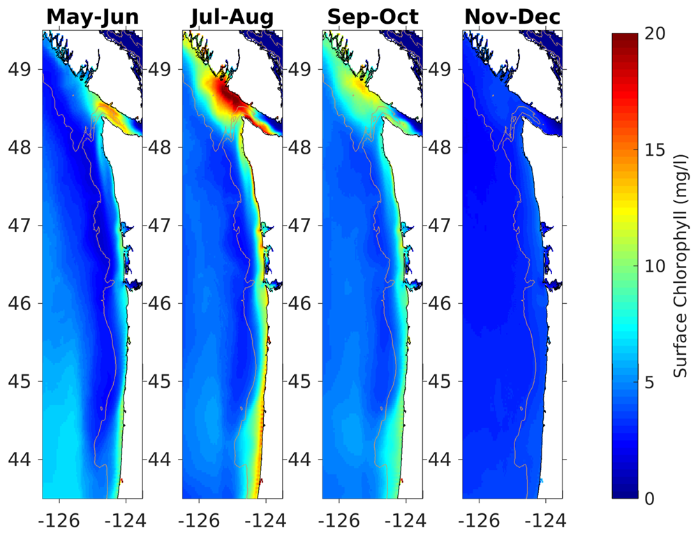 April-initialized model reforecast climatology spanning 2009 - 2017 for chlorophyll (mg/l) integrated over the surface 10 meters of the model domain. Each panel details a two month average; some months are omitted due to low sample size. The 200 meter isobath (the shelf break) is highlighted for reference.