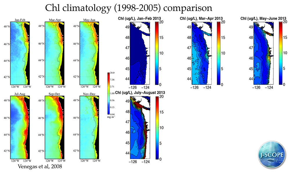 J-SCOPE forecast results for the simulation beginning in January of 2013 are shown in the right panels. Each panel represents a two-month average for the region. The regional climatology from Venegas et al, 2008 is provided on the left for reference, although it covers a slightly larger area than the modeled domain. The forecast projects that the surface Chlorophyll concentrations will be lower than the climatology for the region in January - June of 2013. The forecast projects that the surface Chlorophyll concentrations will be higher than the climatology for the months of July - August of 2013.