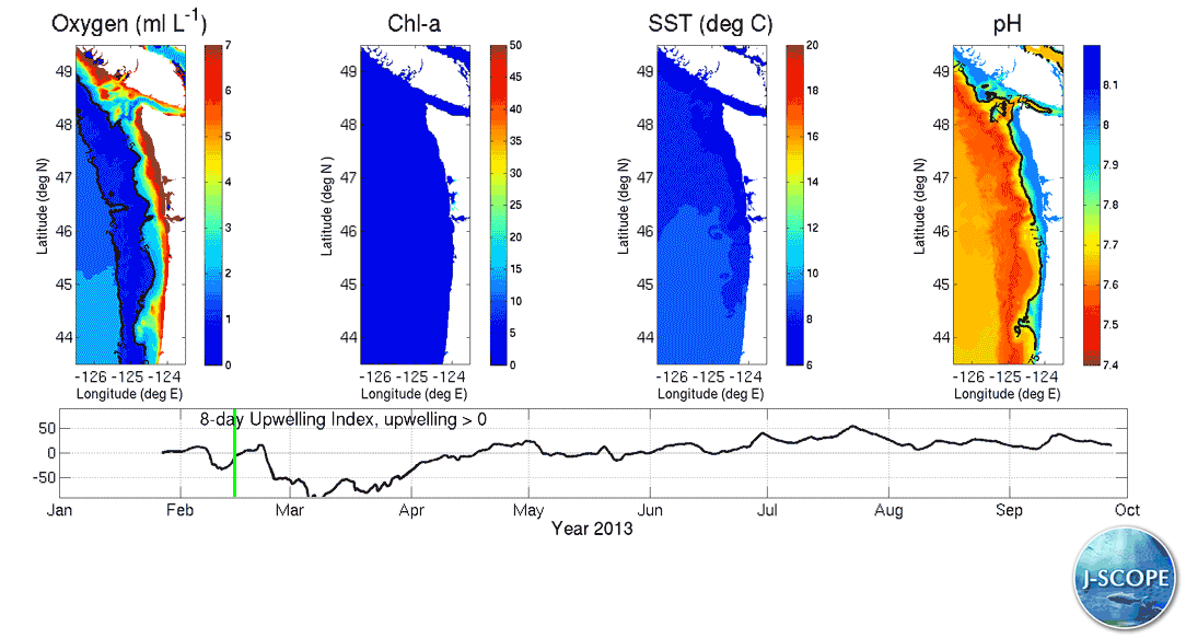 The J-SCOPE forecast system for Washington and Oregon coastal waters presents preliminary results for the 2013 upwelling season. The system predicts the timing of the spring transition, the cumulative upwelling index, sea-surface temperature (SST), primary production, chlorophyll stock, dissolved oxygen, and sardine habitat. All of these fields are reported as monthly averaged anomalies from regional climatologies (Venegas et al, 2008; Pierce et al, 2012; Crawford and Pena, 2013). These predicted quantities are key indicators for the California Current IEA report.