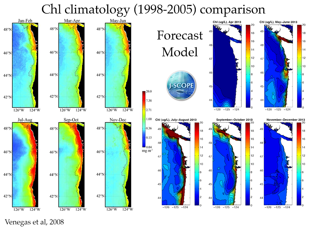 J-SCOPE forecast results for the simulation beginning in April of 2013 are shown in the right panels. Each panel represents a two month average for the region. The regional climatology from Venegas et al, 2008 is provided on the left for reference, although it covers a slightly larger area than the modeled domain. The forecast projects that the surface Chlorophyll concentrations will be lower than the climatology for the Washington shelf in May and June of 2013 while the Oregon coast will be higher than the climatology for the region during that same time. The forecast projects that the surface Chlorophyll concentrations will be higher than the climatology for the months of July - August of 2013. The forecast projects that the surface Chlorophyll concentrations will be lower than the climatology for the entire region in September – December of 2013.