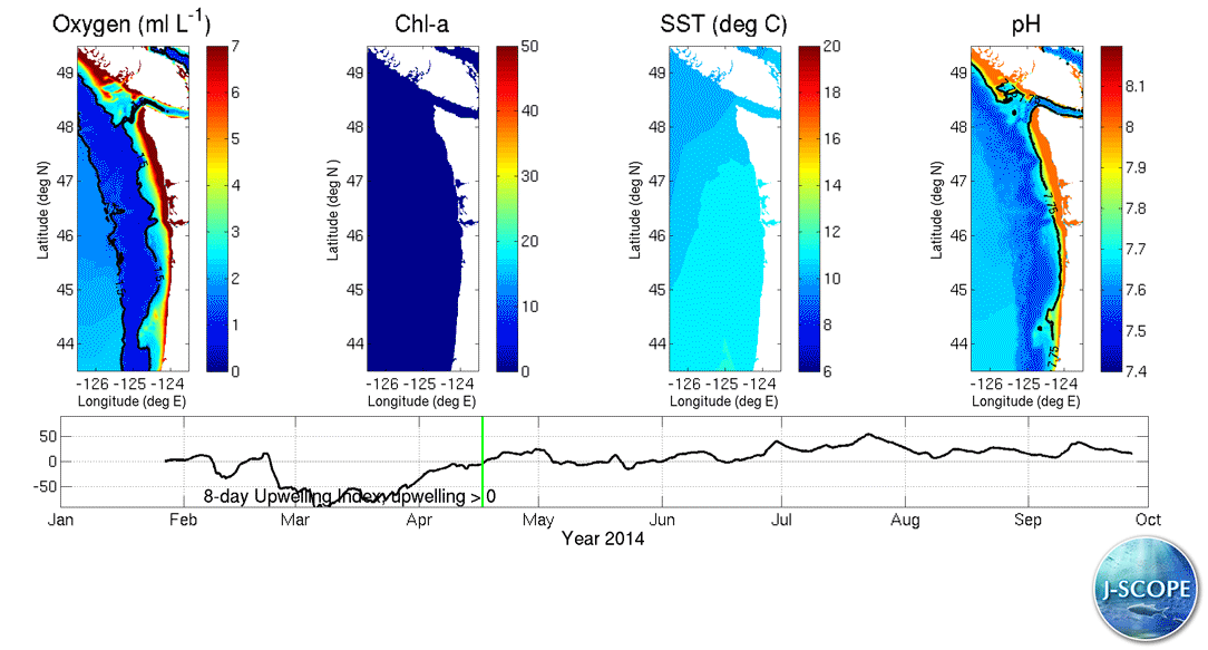 The J-SCOPE forecast system for Washington and Oregon coastal waters presents preliminary results for the 2014 upwelling season. The system predicts the timing of the spring transition, the cumulative upwelling index, sea-surface temperature (SST), primary production, chlorophyll stock, dissolved oxygen, and sardine habitat. All of these fields are reported as monthly averaged anomalies from regional climatologies (Venegas et al, 2008; Pierce et al, 2012; Crawford and Pena, 2014). These predicted quantities are key indicators for the California Current IEA report.