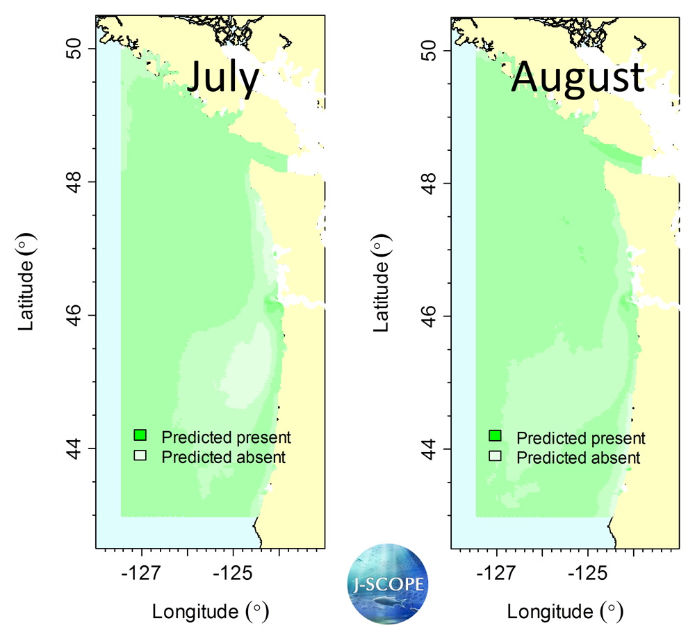 Probability of sardine presence, for July (left) and August (right) of 2015. These five to six month forecasts are the average of a three-member ensemble, with two members initialized as January 15th and one as February 15th. Due to relatively warm sea surface temperature, the forecasts predict habitat suitable for sardine throughout the region. The exception is low salinity water for which the model expects sardine to be found at more intermediate rather than warm temperatures. This leads to low probability of presence in the Columbia River plume. Methods based on: Kaplan IC, Williams G, Bond N, Hermann A, and Siedlecki S. 2016. "Cloudy with a chance of sardines: forecasting sardine distributions using regional climate models." Fisheries Oceanography. 25:1, 15-27.