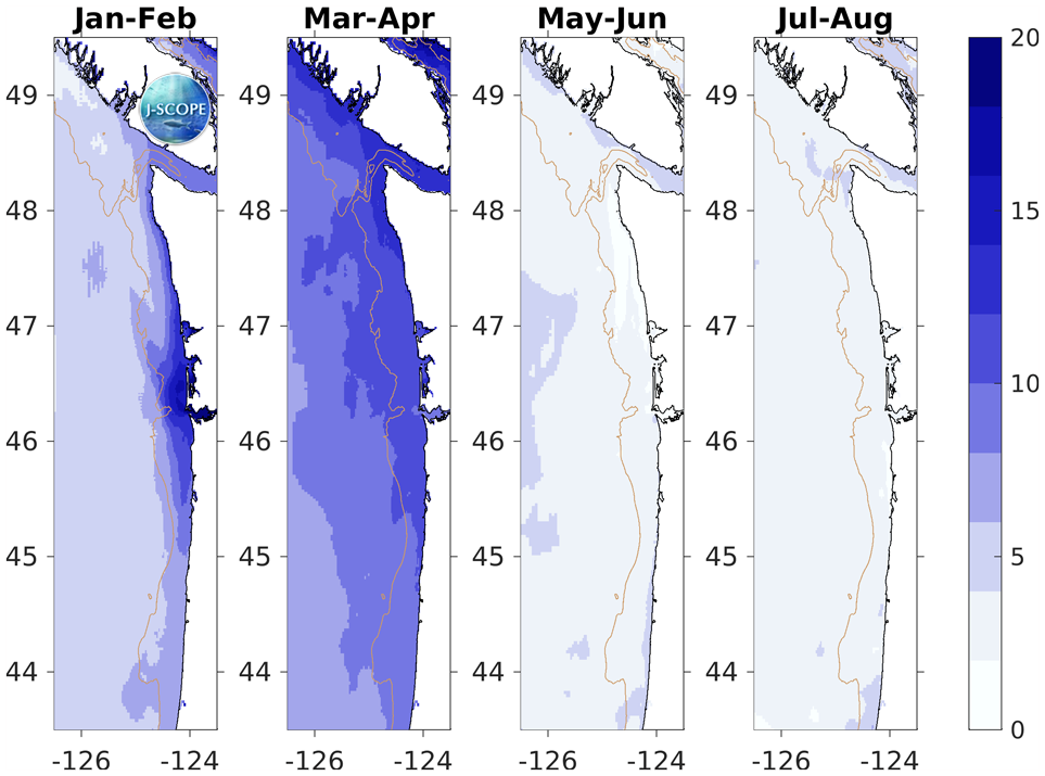 J-SCOPE forecast results for the simulation beginning in February of 2015 are shown in the first figure below. Each panel represents a two-month average for the region averaged over three model runs of the ensemble . January through April has a different color bar than May through August. The regional climatology from Venegas et al, 2008 is provided directly below the forecast plots for reference, although it covers a slightly larger area than the modeled domain. The panels directly under the climatology depict the relative uncertainty from the ensemble for the same time period.