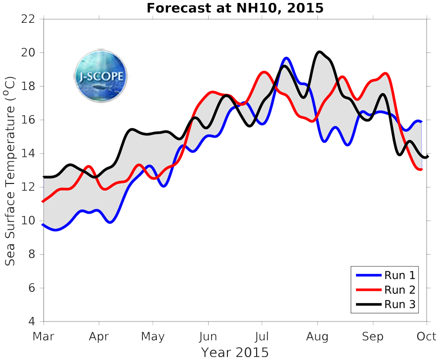 The SST was forecast using all three model runs of the ensemble for two point locations where buoys exist, Ćháʔba· off La Push, WA, and NH-10 off Newport, OR, are shown at the bottom of the page.