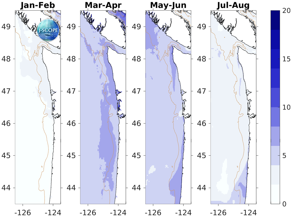 Finally, climatological cross-sections from the Newport Line in Oregon, as well as the Grays Harbor Line in Washington, are compared to the forecasted average of the ensemble members. The forecast projects that the temperatures for the upwelling season of 2016 will be higher than the climatology and extend down to over 100 meters depth below the surface covering much of the shelf in both Washington and Oregon.