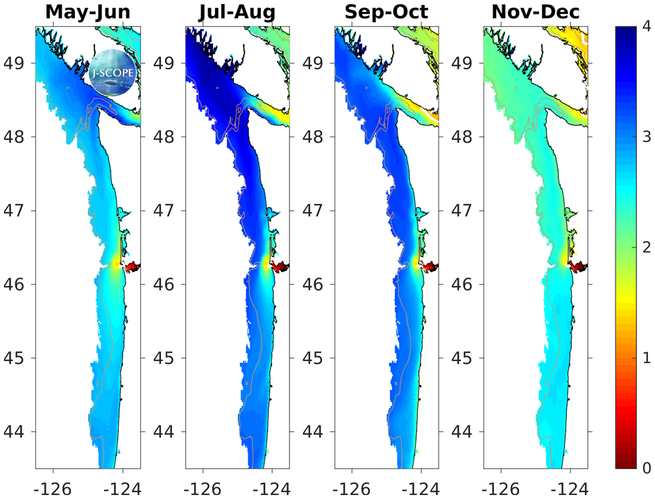 From the maps, aragonite saturation state, at the surface is forecasted to be supersaturated over much of the year, with the exception of the region surrounding the mouth of the Columbia River. This region is undersaturated at times, and experiences long periods of time below thresholds identified as critical to juvenile oysters.