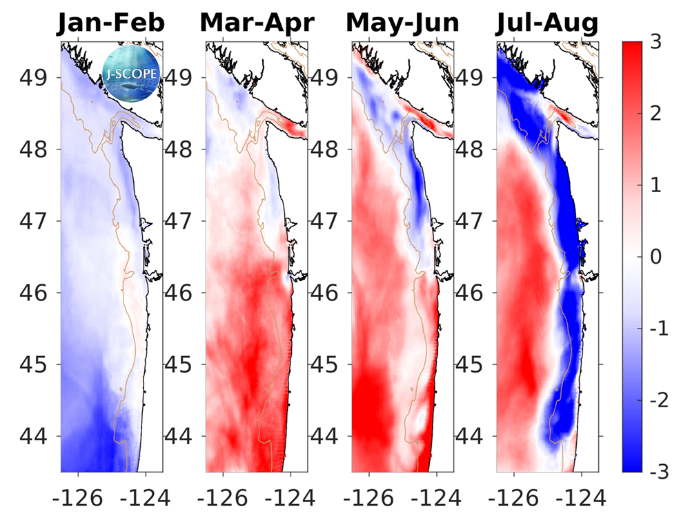 J-SCOPE forecast results for the model run beginning in January of 2017 are shown in the first figure. Each panel represents ensemble averaged anomalies of two month averages for the region. The panels directly under the climatology depict the relative uncertainty from the ensemble for the same time period.