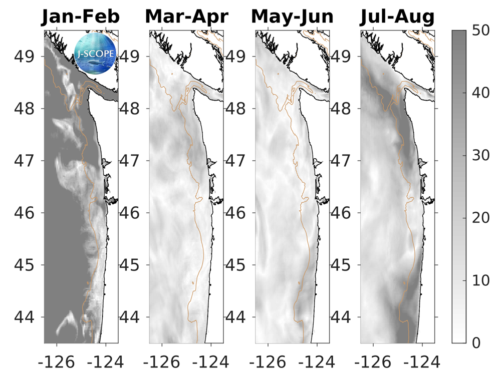 For waters off the Washington coast, the forecast projects that 10-meter integrated Chlorophyll will be lower than climatology in early averaged time-periods (January - February, March - April, May - June, and July - August) on the Washington shelf for 2017. The relative uncertainty is highest (40%) right along the coast in late summer (August - September) and initially (January - February).