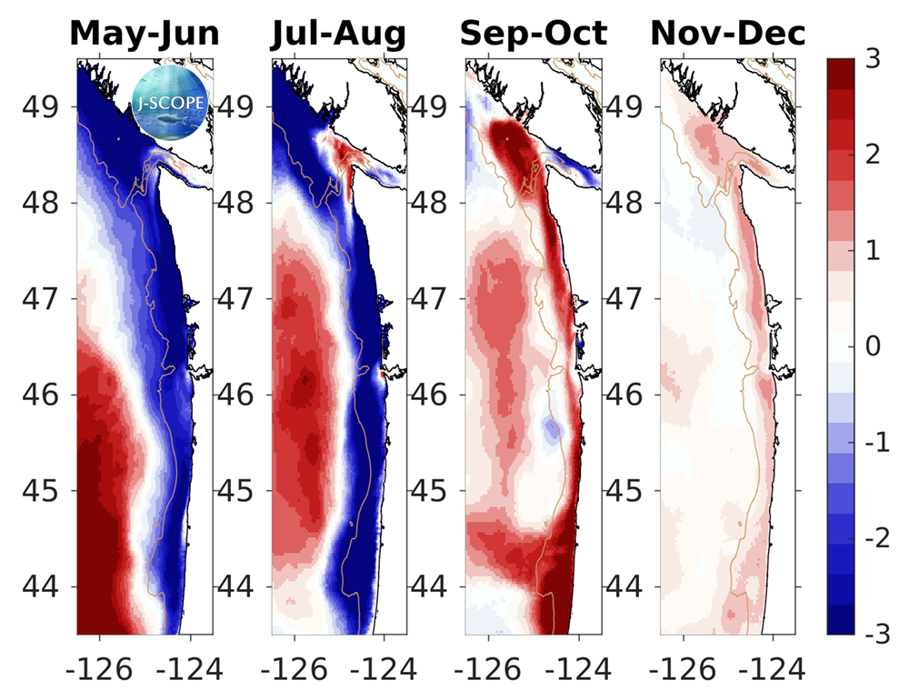For waters off the Washington coast, the forecast projects that 10-meter integrated chlorophyll will be lower than climatology during the summer upwelling season (May - June, July - August) on the shelf, but will show a relative increase near shore in the fall (September - October, November - December). The relative uncertainty is highest near the shelf break throughout the summer and early fall (May - June, July - August, September - October).