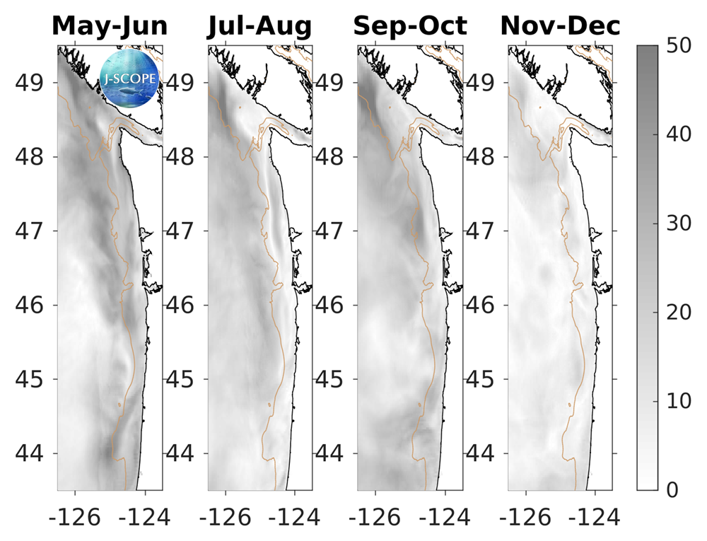 For waters off the Oregon coast, a similar pattern is forecasted: chlorophyll on the shelf is projected to be lower than climatology in early averaged time-periods (May - June, July - August) but higher than climatology in the fall. Offshore chlorophyll is projected to be higher than climatology initially (May - June, July - August) but then approach climatology by late fall (November - December). Relative uncertainty is highest near the shelf-break initially but decreases in the late fall (November - December).