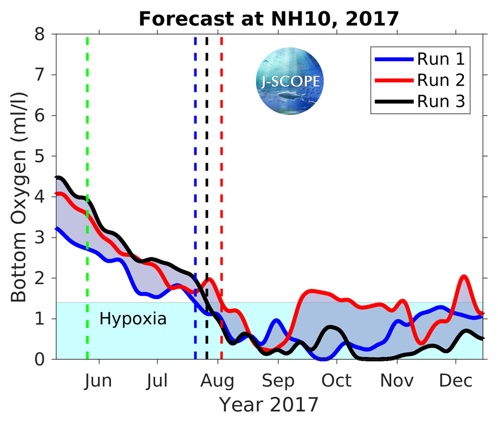 Time series for bottom oxygen at the NH-10 (~45°N) for each of the three ensemble members. Hypoxia is outlined by the blue region on the plot. The timing of each run’s onset of hypoxic conditions for more than 8 days is identified by the vertical dotted lines, with the green line indicating the climatological timing.