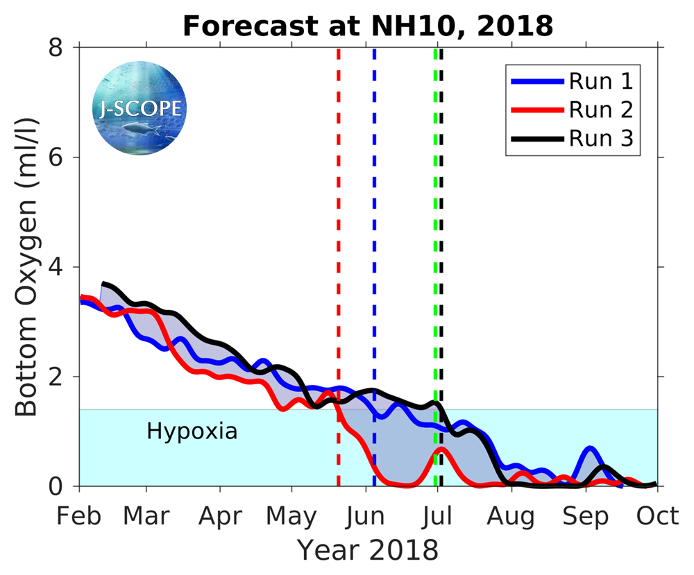 Time series of bottom oxygen from the Washington coast near one of the Olympic Coast National Marine Sanctuary (OCNMS) moorings at Cape Elizabeth (site CE042), from NH-10 mooring off of Newport, Oregon, and from the Ćháʔba· mooring off of La Push, Washington, are shown for each member of the ensemble. The model forecasts that hypoxia will most likely develop at the NH-10 and CE042 moorings in early-mid June, which is about one month before than the climatological onset of hypoxia (green). Another time series from the outer Washington shelf, Ćháʔba·, forecasts hypoxia onset in all three ensemble members between July and mid-September at this location, indicating a highly uncertain forecast for this location.