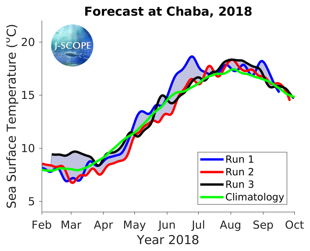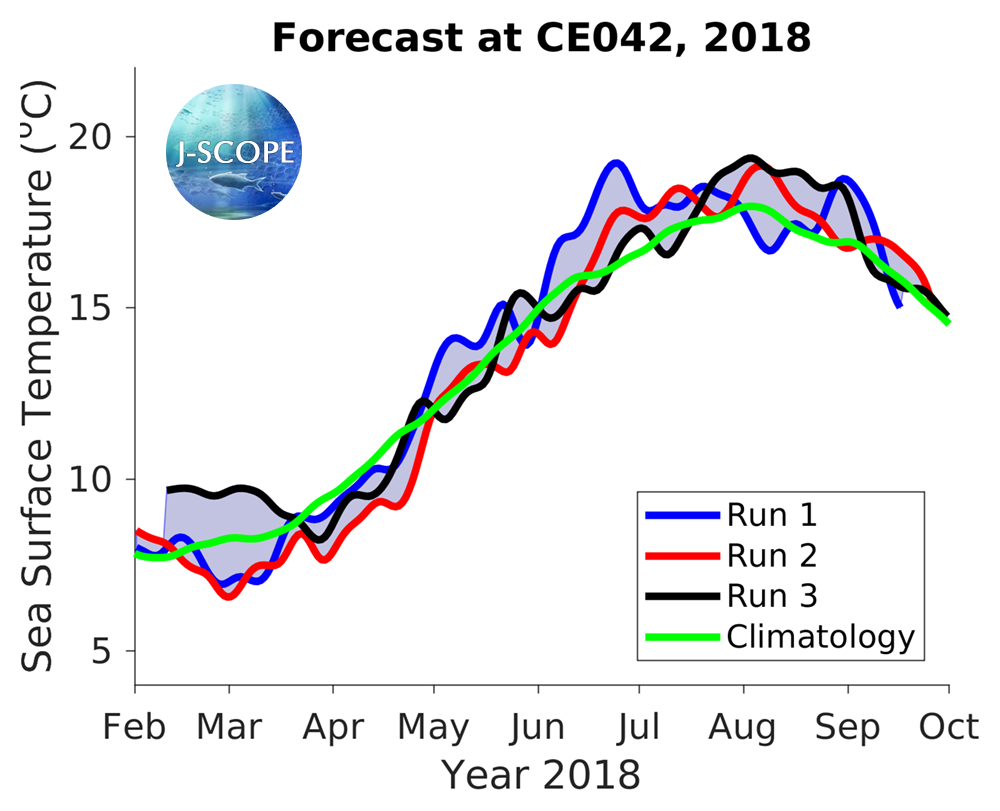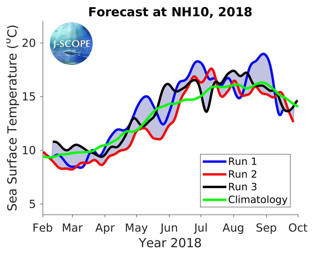 The SST was forecast using all three model runs of the ensemble for three point locations where buoys exist, Ćháʔba· off La Push, Washington, NH-10 off Newport, Oregon, and CE042 in the Olympic Coast National Marine Sanctuary, are shown at the below. All three indicate warmer SSTs than the climatology during the summer upwelling season.