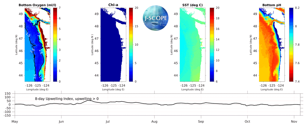 The movie above shows the J-SCOPE forecast for 2018, from ensemble model run 3 initialized on April 25. More information about the three panels on the left can be found by navigating the Oxygen, Chlorophyll, and Sea Surface Temperature tabs above. The panel on the far right depicts the evolution of bottom water pH over the forecast period. The pH field is calculated using an empirical relationship established by Alin et al., in prep. This work is part of a collaboration between Samantha Siedlecki, J-SCOPE, and the Ocean Acidification group at NOAA PMEL. The 8-day upwelling index is calculated using the method described in Austin and Barth (2002) and can also be found under the California Current Indicators tab above.