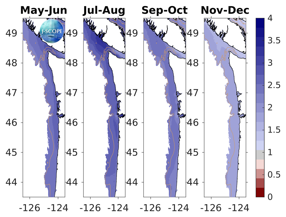 The modeled region bottom aragonite saturation state (Ω) averaged over all three ensemble members and in time for (from left to right) May - June, July - August, September - October, November - December. For reference, Ω=1 is the physical chemistry defined boundary between undersaturated and saturated conditions, but stressful conditions for juvenile oysters begin to occur before the waters become undersaturated (Ω=1.3). The 200m isobath is outlined by the beige contour line.