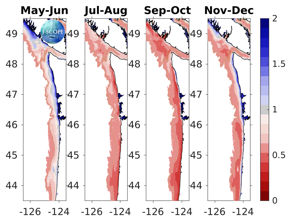Aragonite saturation state at the seafloor is forecasted to decrease over the course of the summer upwelling season and into the fall, with a slight increase toward the end of the forecast (November - December). In Washington, nearshore areas are forecasted to be supersaturated at the beginning of the upwelling season (May - June) and again at the end of the forecast (November - December), while the rest of the shelf area remains undersaturated. In Oregon, most of the modeled region is forecasted to be undersaturated for the entire forecast season, with the exception of a few isolated coastal locations in May - June and November - December.