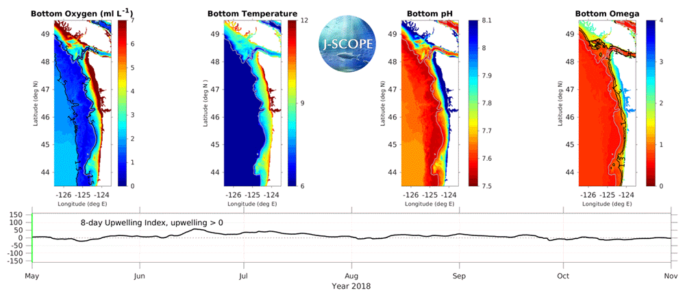 The forecasts simulate conditions in 2018. The pH and Ω fields are calculated using an empirical relationship established by Alin et al., in prep. This work is part of a collaboration between Samantha Siedlecki, J-SCOPE, and the Ocean Acidification group at NOAA Pacific Marine Environmental Laboratory (PMEL).
