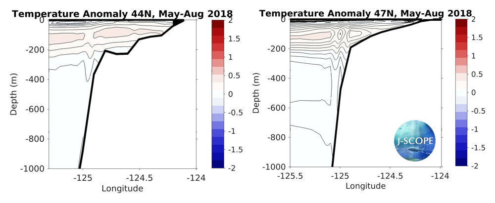 The modeled cross-section from the Newport Line (left, 44°N) and the Grays Harbor Line (right, 47°N), averaged over all three ensemble members, and averaged over the summer upwelling months (May - August). These cross-sections are anomalies from the April-initialized reforecast climatology.