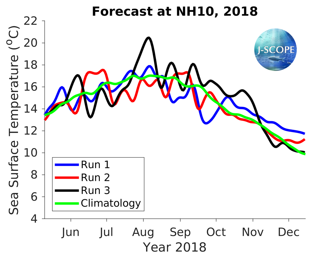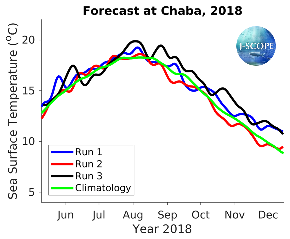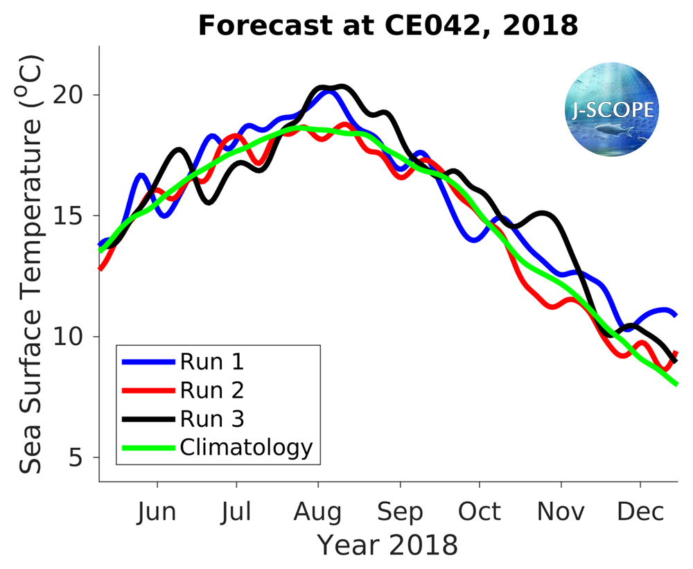 The SST was forecast using all three model runs of the ensemble for three point locations where buoys exist, Ćháʔba· off La Push, Washington, NH-10 off Newport, Oregon, and CE042 in the Olympic Coast National Marine Sanctuary, are shown at the bottom of the page. In comparison to the climatology, the three ensemble members indicate approximately climatological SSTs initially (May - June), with a the forecast favoring warmer conditions in late summer and early fall (July - August; October - December), although there is a lot of uncertainty in the forecast in late summer, early fall.
