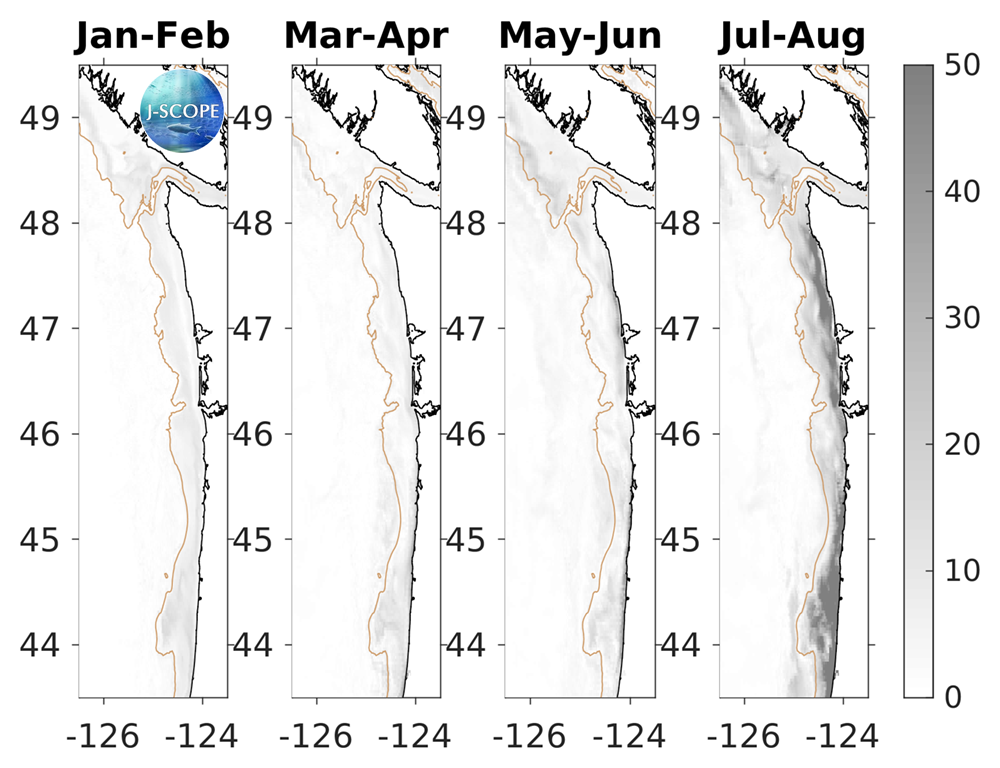 Hypoxia extends upward into the water column as well. The percentage of the water column that is forecasted to experience hypoxia (O2 < 2 mg/l) is a metric for this phenomenon. Early in the upwelling season, hypoxia is forecasted to occupy a small percentage of the water column over the entire modeled region (<10%). In July, some regions in Oregon, nearshore, and around Cape Elizabeth begin to experience more (~20%). Over the course of the summer, the percentage of the water column that is hypoxic increases coast-wide, with particularly high volumes forecasted for Heceta Bank on the Oregon shelf and around Cape Elizabeth in August and September with values of up to 50% of the water column experiencing hypoxia.