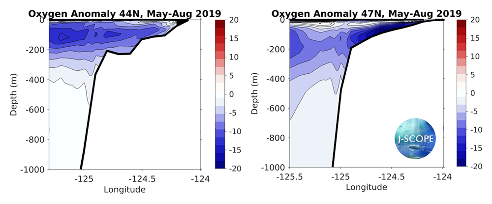 Finally, climatological cross-sections from the Newport Line in Oregon (44°N) and the Grays Harbor Line in Washington (47°N) are compared to the forecasted average of the ensemble members during the summer upwelling season (May - August). In both Oregon and Washington, the forecast projects that the oxygen concentration for the upwelling season of 2019 will be lower than the climatology on both the shelf and at deeper depths, with the largest anomalies occurring between the surface and ~350 m depth in Oregon, and 500 m depth in Washington.