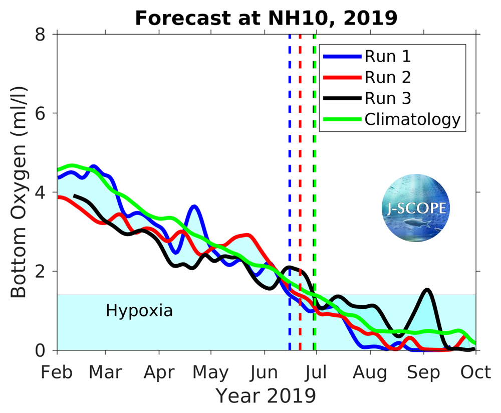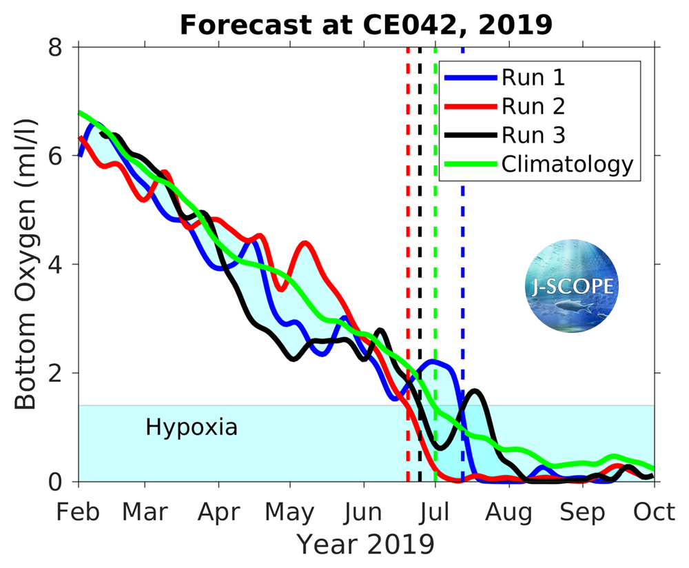 The emergence of anoxia in the model in late summer is caused by a bias associated with the lack of relaxations in the winds (found to be important in a paper by Adams et al, 2013) in the Climate Forecast System input files as well as a bias in the shortwave radiation (see 2013, Year in Review). The model does have skill in predicting the emergence and severity of hypoxia, while it is biased low for these reasons. Given the difficulty in predicting the fall transition in prior forecasts (see 2013, Year in Review), the forecast for low oxygen levels forecasted well into August is highly uncertain.