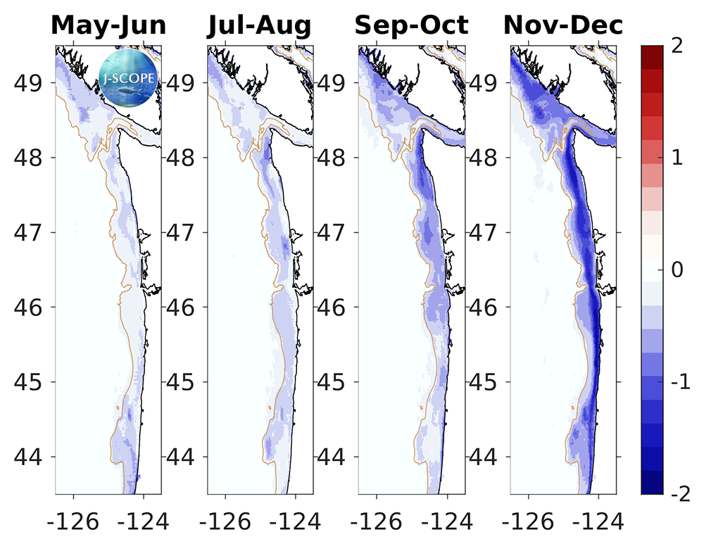 The modeled region bottom oxygen (ml/l) anomaly averaged over all three ensemble members and in time for (from left to right) May - June, July - August, September - October, November - December.
