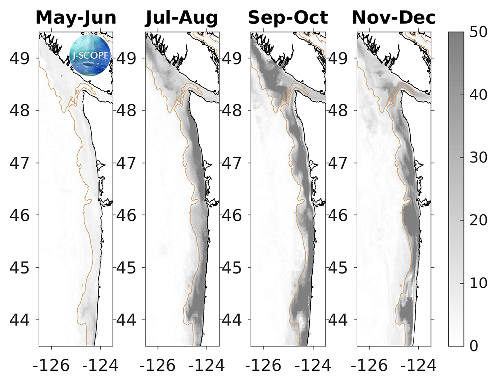 Hypoxia extends upward into the water column as well. The percentage of the water column that is forecasted to experience hypoxia (O2 < 2 mg/l) is a metric for this phenomenon. Early in the upwelling season, hypoxia is forecasted to occupy only a very small percentage of the water column over the entire modeled region (<10%). In July, much of the Oregon shelf, and a narrow swath near the Washington coast around Cape Elizabeth begin to experience more hypoxia (~20%). Over the course of the summer, the percentage of the water column that is hypoxic increases coast-wide, with particularly high volumes forecasted for Heceta Bank on the Oregon shelf and around Cape Elizabeth in August and September with up to 50% of the water column experiencing hypoxia.