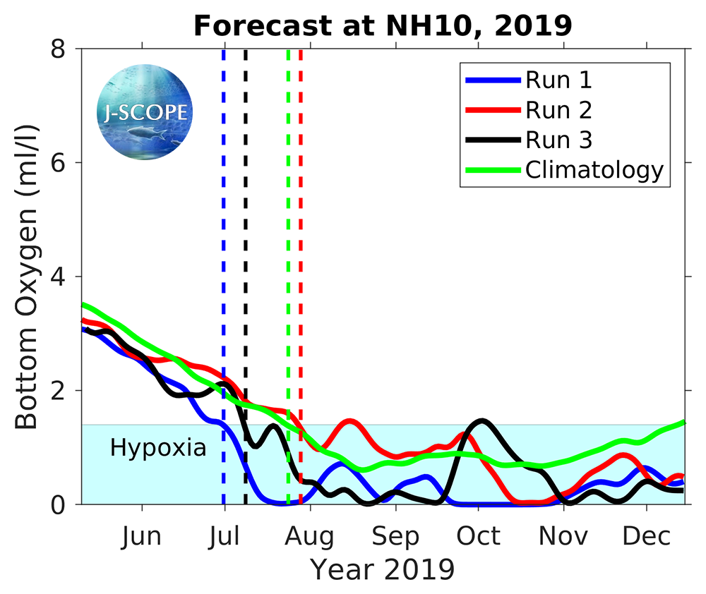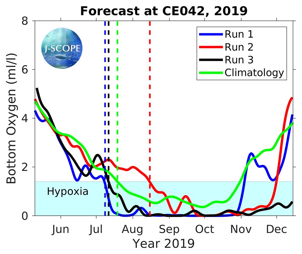 The emergence of anoxia in the model in late summer is caused by a bias associated with the lack of relaxations in the winds (found to be important in a paper by Adams et al, 2013) in the Climate Forecast System input files as well as a bias in the shortwave radiation (see 2013, Year in Review). The model does have skill in predicting the emergence and severity of hypoxia, while it is biased low for these reasons. Given the difficulty in predicting the fall transition in prior forecasts (see 2013, Year in Review), the forecast for low oxygen levels forecasted well into August is highly uncertain.