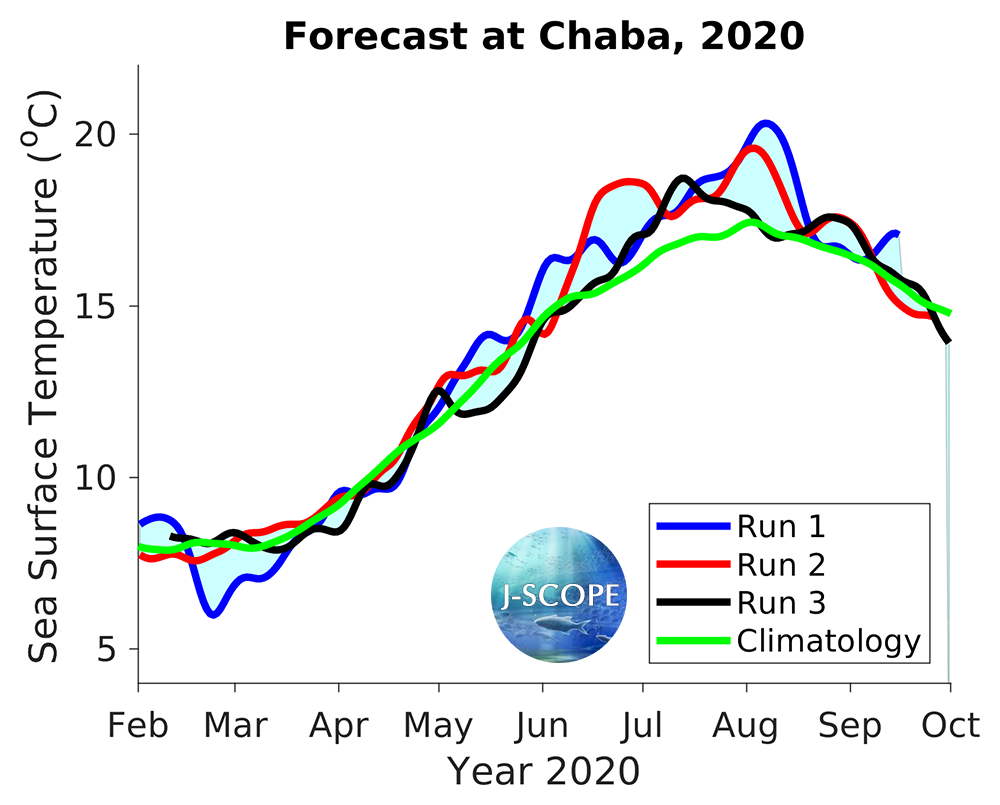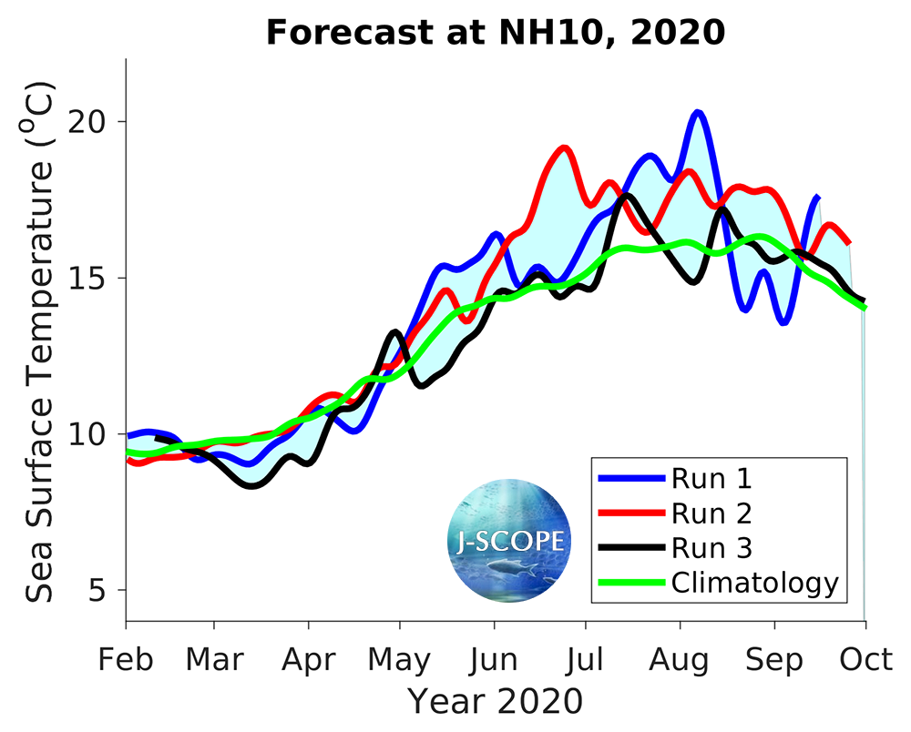 The SST was forecast using all three model runs of the ensemble for three point locations where buoys exist, Ćháʔba· off La Push, Washington, NH-10 off Newport, Oregon, and CE042 in the Olympic Coast National Marine Sanctuary, are shown below. All three indicate warmer SSTs than the climatology during most of the summer upwelling season.