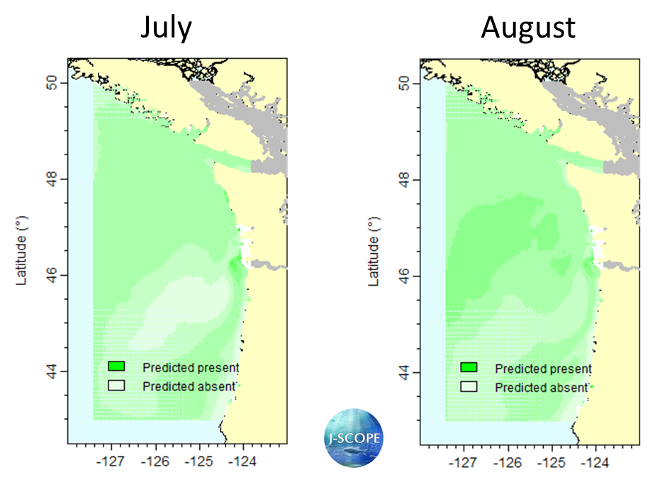 Sardine habitat, for July (left) and August (right) of 2020. These six to seven month forecasts are the average of a three-member ensemble, initialized on April 5th, 15th, and 25th. Due to relatively warm sea surface temperature, the forecasts predict habitat suitable for sardine throughout the region. The exception is low salinity water, for which the model expects sardine to be found at more intermediate rather than warm temperatures. This leads to low probability of presence in the offshore regions of the Columbia River plume, particularly in July. Methods based on: Kaplan IC, Williams G, Bond N, Hermann A, and Siedlecki S. 2016. "Cloudy with a chance of sardines: forecasting sardine distributions using regional climate models". Fisheries Oceanography. 25:1, 15–27.