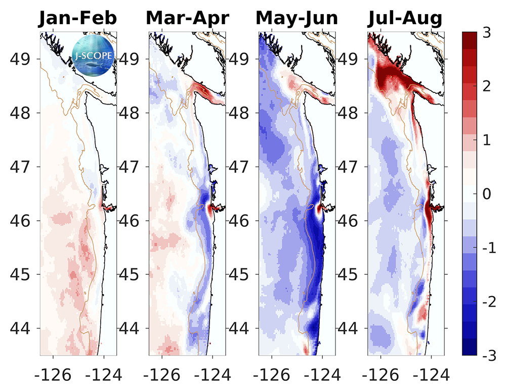 For waters off the Washington and Oregon coast, the forecast projects that 10-meter integrated chlorophyll will be lower than climatology, with exceptions of higher than climatology chlorophyll near the mouths of the Strait of Juan de Fuca and the Columbia River at the beginning of the upwelling season (May - June). Later in the upwelling season (July - August), the chlorophyll values near the outflow from the Strait of Juan de Fuca including the region associated with the Juan de Fuca Eddy and the Columbia River will continue to increase above climatology, while the remainder of the continental shelves and offshore areas are near or slightly lower than climatology. The relative uncertainty is highest at the beginning of the forecast when chlorophyll levels are low. Overall uncertainty is lower during the upwelling season, but it still varies spatially with uncertainty generally lower nearshore and higher around the shelf break.