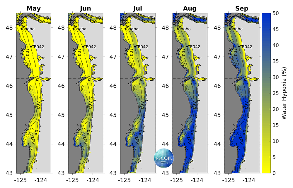The modeled region water column hypoxia (%) averaged over all three ensemble members and in time for (from left to right) May, June, July, August, and September. Land is shown in light grey, and offshore areas are shaded dark gray. The black dashed line indicates the boundary between Washington and Oregon waters. Black contours indicate bathymetry on the shelf. Two mooring locations are plotted for reference (Ćháʔba·, CE042).