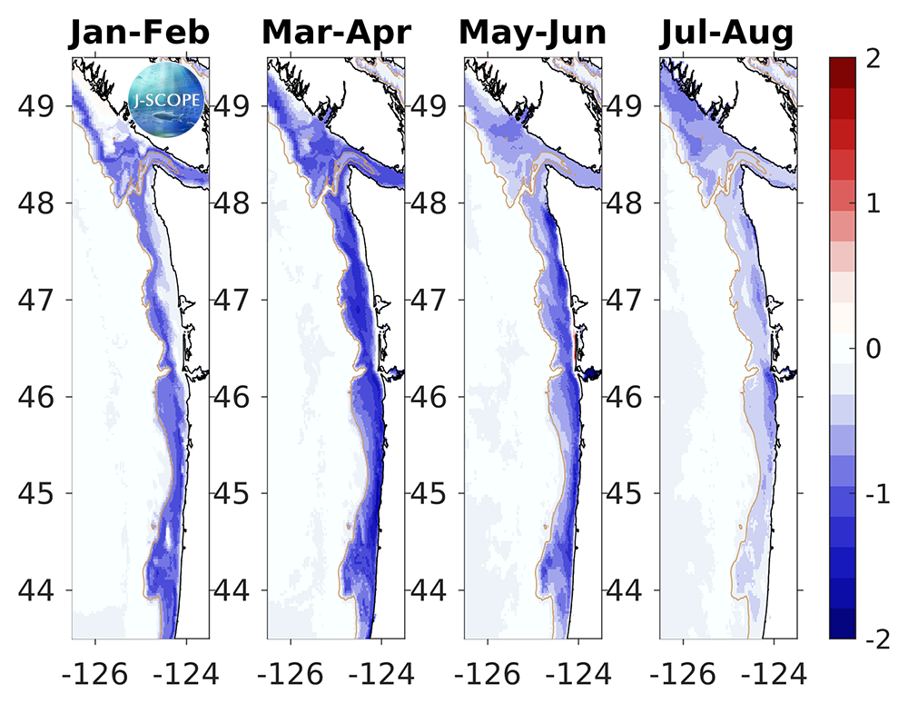 Forecast bottom oxygen concentrations (mg/l), averaged over three ensemble members for each month of the upwelling season, indicate declines in oxygen concentrations over the course of the forecast for both Washington and Oregon, with hypoxia (O2 < 2 mg/l) prominent over much of the Oregon shelf and near the Washington shelf break as early as May. Hypoxia is forecast to expand to much of the Washington shelf by July including regions of the Olympic Coast National Marine Sanctuary and the Ćháʔba· mooring.
