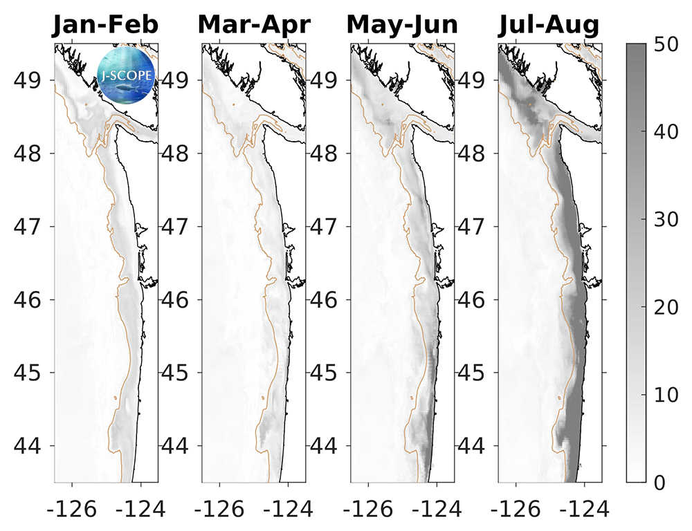 Hypoxia extends upward into the water column as well. The percentage of the water column that is forecast to experience hypoxia (O2 < 2 mg/l) is a metric for this phenomenon. By combining this forecast with the forecast for bottom hypoxia (above), we can get an idea of how extensive hypoxia may be in the three-dimensional ocean habitat. Early in the upwelling season, hypoxia is forecast to occupy a small percentage of the water column over the entire modeled region (<10%). In June, shelf waters in Oregon begin to experience more hypoxia (~20%). Over the remainder of the upwelling season, hypoxia expands vertically coast-wide, with particularly high volumes forecast for the Oregon shelf (up to 50%) in August and September and the Washington shelf experiencing lower volumes of hypoxia. All together, these figures suggest that the widespread hypoxia forecast above is limited to near bottom habitats for the majority of the Washington coast during the upwelling season while hypoxia expansion into the water column is more extensive in Oregon.