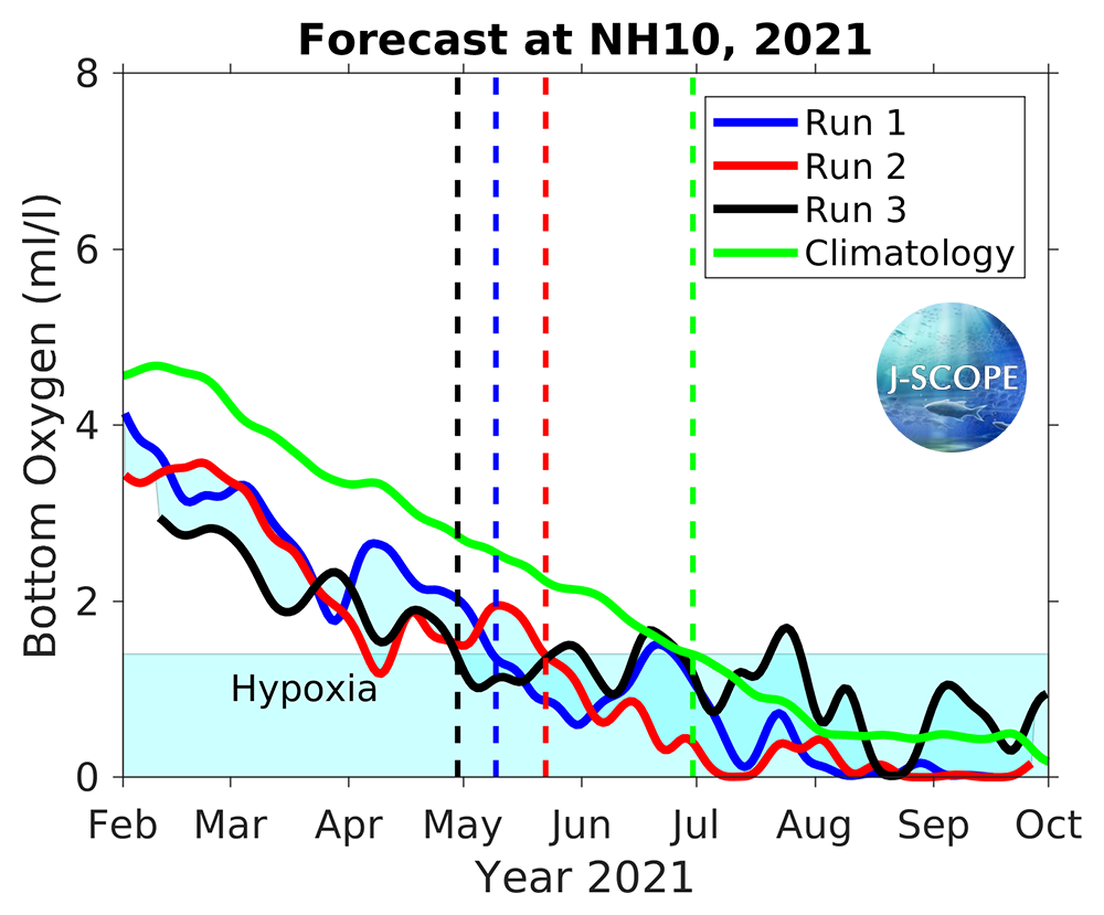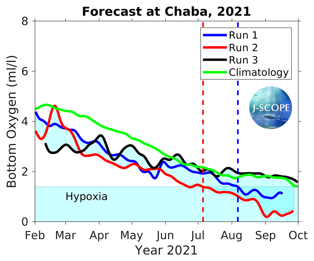Time series of bottom oxygen from the Washington coast near one of the Olympic Coast National Marine Sanctuary (OCNMS) moorings at Cape Elizabeth (site CE042), from NH-10 mooring off of Newport, Oregon, and from the Ćháʔba· mooring off of La Push, Washington, are shown for each member of the ensemble. The model forecasts that hypoxia will most likely develop at all three moorings - but most likely at the NH-10 mooring - before the climatological onset of hypoxia (green). Another time series from the outer Washington shelf, Ćháʔba·, forecasts hypoxia is unlikely for this location, but one of the three ensemble members forecasts hypoxia will set in here in July.