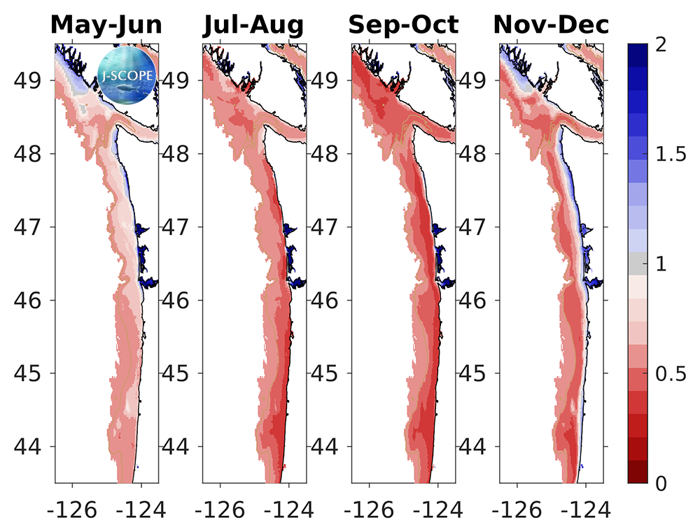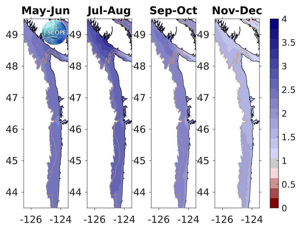 The modeled region bottom aragonite saturation state (Ω) averaged over all three ensemble members and in time for (from left to right) May - June, July - August, September - October, November - December. For reference, Ω = 1 is the physical chemistry defined boundary between undersaturated and saturated conditions, but stressful conditions for juvenile oysters begin to occur before the waters become undersaturated (Ω = 1.3). The 200m isobath is outlined by the beige contour line.