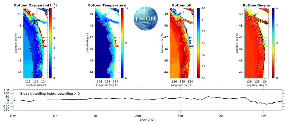 The forecasts simulate conditions in 2021. The pH and Ω fields are calculated using an empirical relationship established by Alin et al., in prep. This work is part of a collaboration between Samantha Siedlecki, J-SCOPE, and the Ocean Acidification group at NOAA Pacific Marine Environmental Laboratory (PMEL).