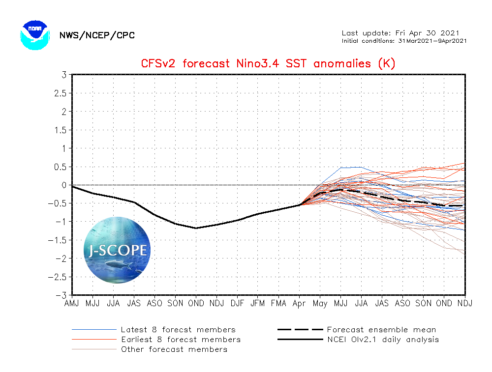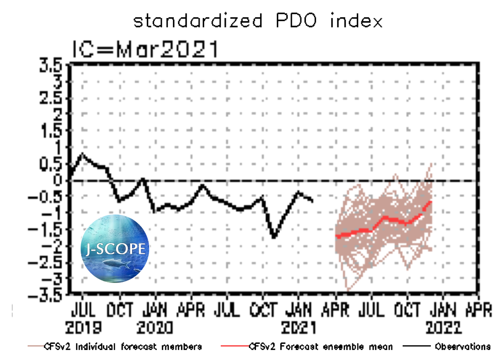 - Pacific Decadal Oscillation: The April 2021 CFS forecasts negative PDO conditions to continue through the summer and fall of 2021.