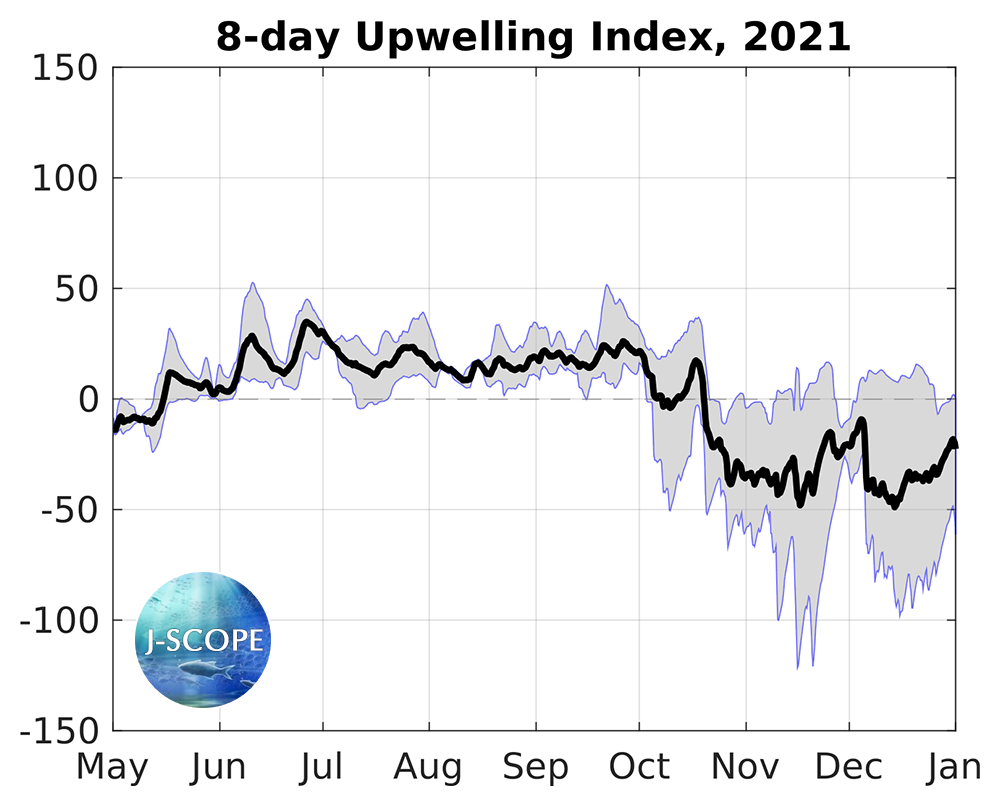 - Regional Upwelling Indices which drive local primary production: The wind product reported here is the 8-day Upwelling Index. The average of all three model runs making up the ensemble is plotted as a solid line with the range of ensemble runs shown as a gray cloud around the line. Positive values indicate upwelling; negative values indicate downwelling.