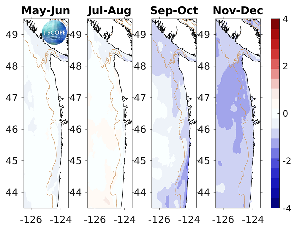 For waters off the Washington and Oregon coast, the forecast projects that SST will be near climatology throughout the upwelling season (May - August) and slightly lower than climatology during the fall (September - December). The relative uncertainty is very low during the upwelling season (May - August) and, although it increases slightly in the fall (September - December), it is still low (<10%) for the entire forecast.