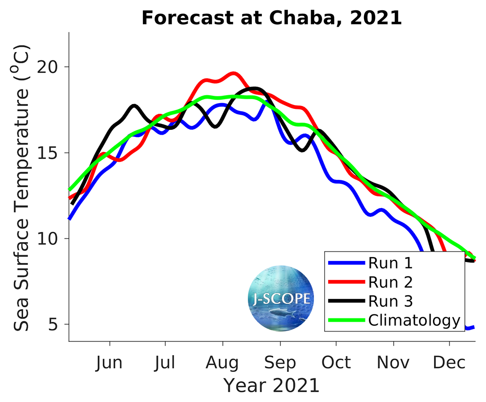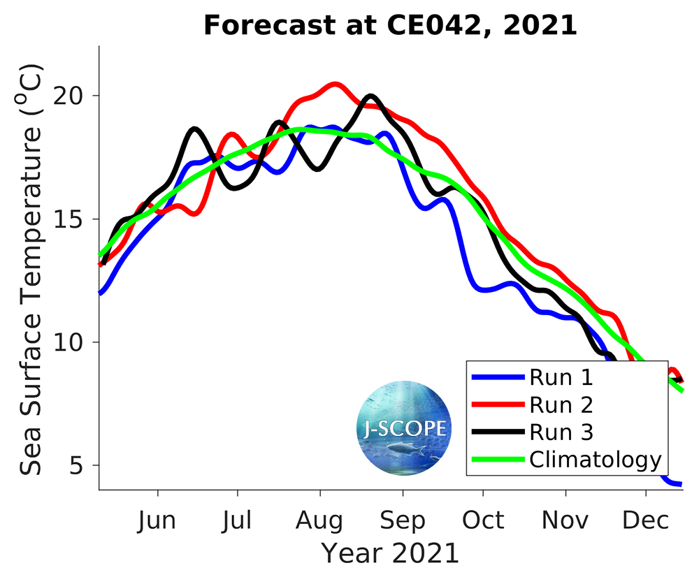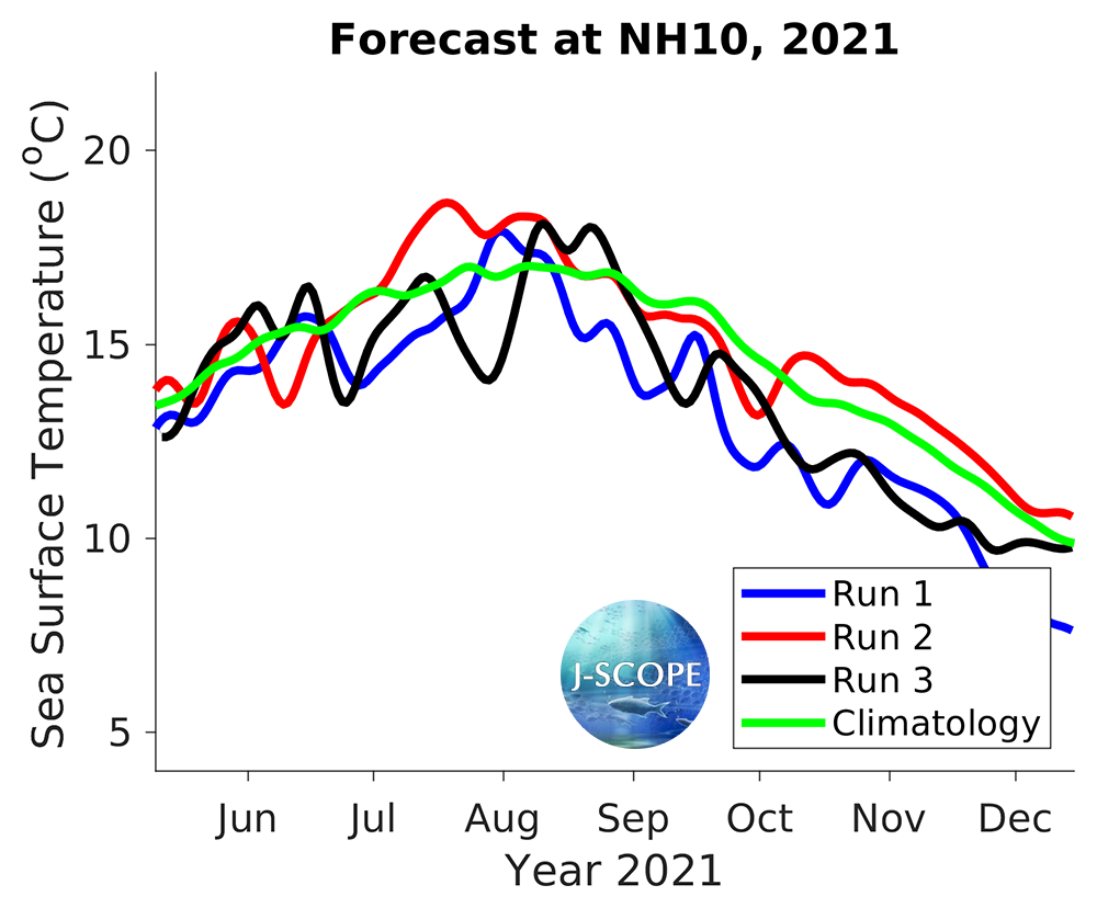 The SST was forecast using all three model runs of the ensemble for three point locations where buoys exist, Ćháʔba· off La Push, Washington, NH-10 off Newport, Oregon, and CE042 in the Olympic Coast National Marine Sanctuary (shown below). All three indicate that SSTs will be near or slightly cooler than climatology during the summer upwelling season and into the fall months.