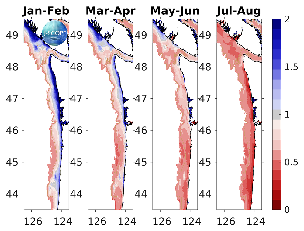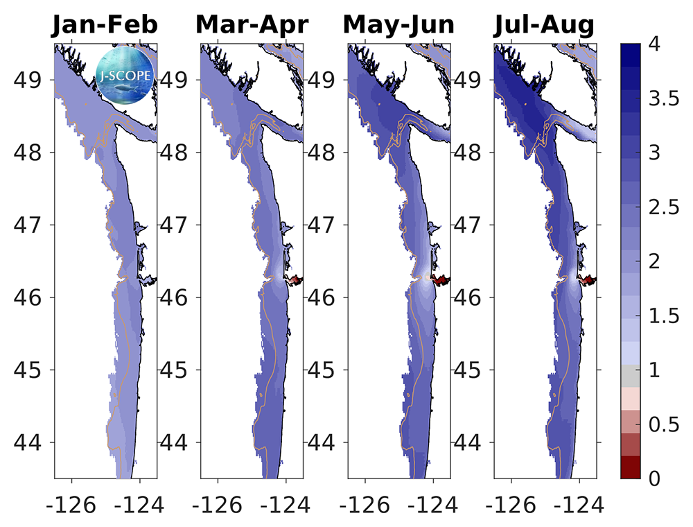 The modeled region bottom aragonite saturation state (Ω) averaged over all three ensemble members and in time for (from left to right) January - February, March - April, May - June, July - August. For reference, Ω = 1 is the physical chemistry defined boundary between undersaturated and saturated conditions, but stressful conditions for juvenile oysters begin to occur before the waters become undersaturated (Ω = 1.3). The 200m isobath is outlined by the beige contour line.