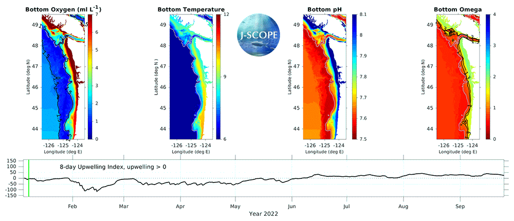 The movie above shows the J-SCOPE forecast for 2022, from ensemble model run 1 initialized on January 5. The 8-day upwelling index is calculated using the method described in Austin and Barth (2002) and can also be found under the California Current Indicators tab above.
